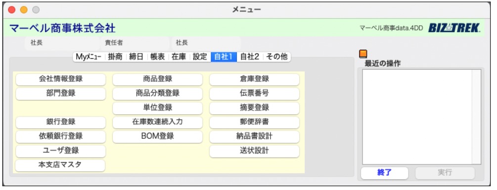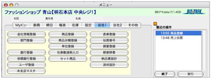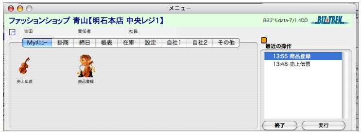 BIZTREK BackOfficeマニュアル BO02002_[基本操作]メニュー選択方法 BIZTREK BackOfficeマニュアル 2023.08.042023.08.06 ●全てボタンメニュー で処理を選択します。 ●使用頻度の高いメニューを『Myメニュー』登録して、毎日の処理メニューの実行が簡単に行えます。 『Myメニュー』登録方法については10.Myメニューをご覧ください。