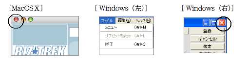 ●ほとんどのメニューは、「閉じる」「キャンセル」「取消し」「登録」等のボタンで終了することが出来ます。 これらのボタンを表示していない画面では、画面左 又は 右上のクローズボックスクリックでメニューを終了します。