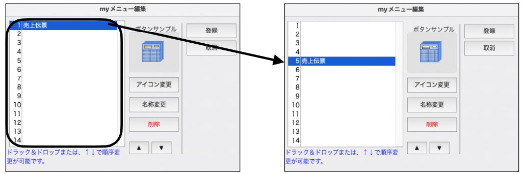 メニューを選択してドラッグ&ドロップで移動。 または メニューをクリック選択し、↑↓ボタンクリックで一行づつ移動します。